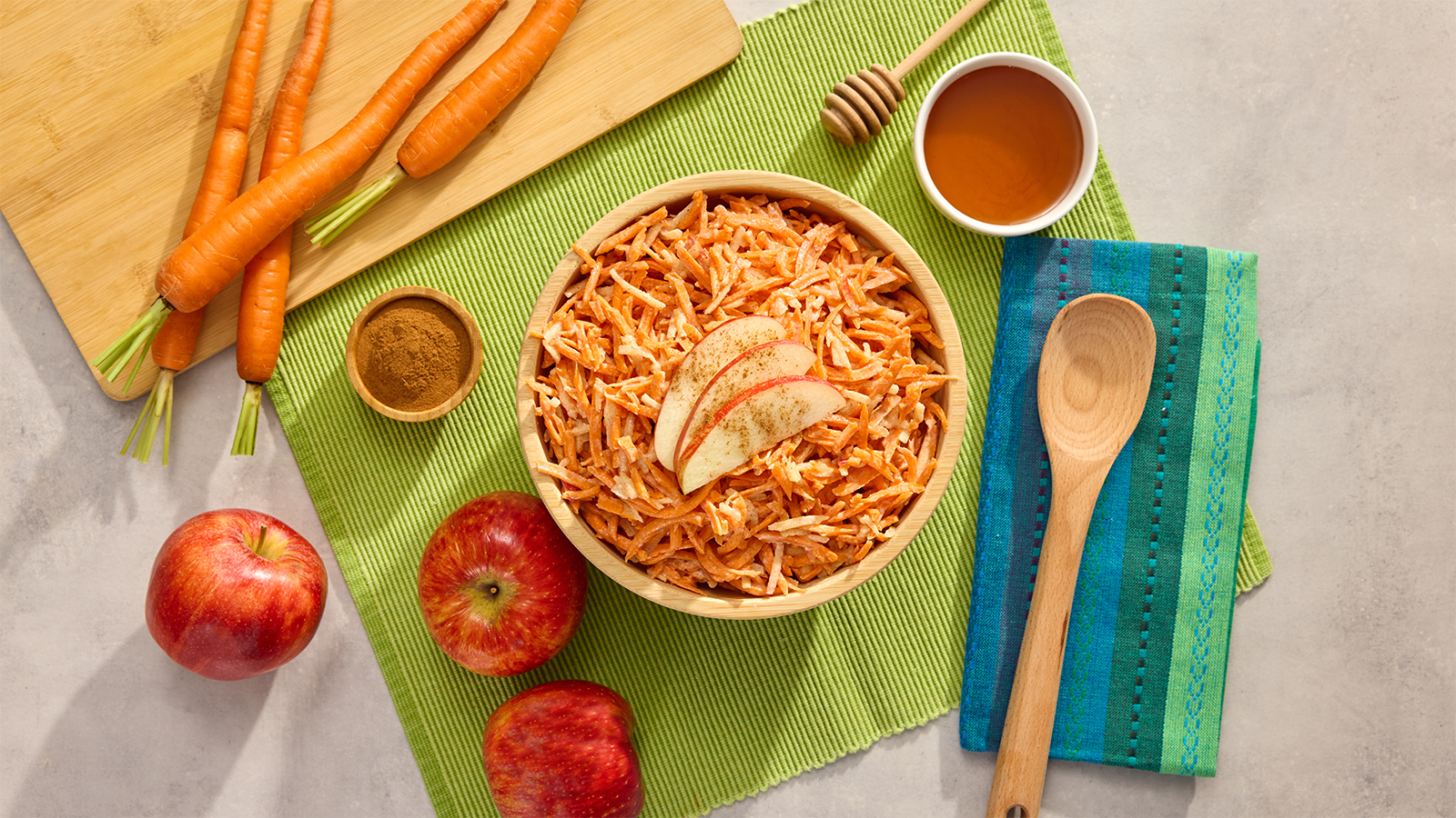 1. Add apple, cinnamon, vanilla, and sweetener of your choice to the carrot slaw base. Mix well.