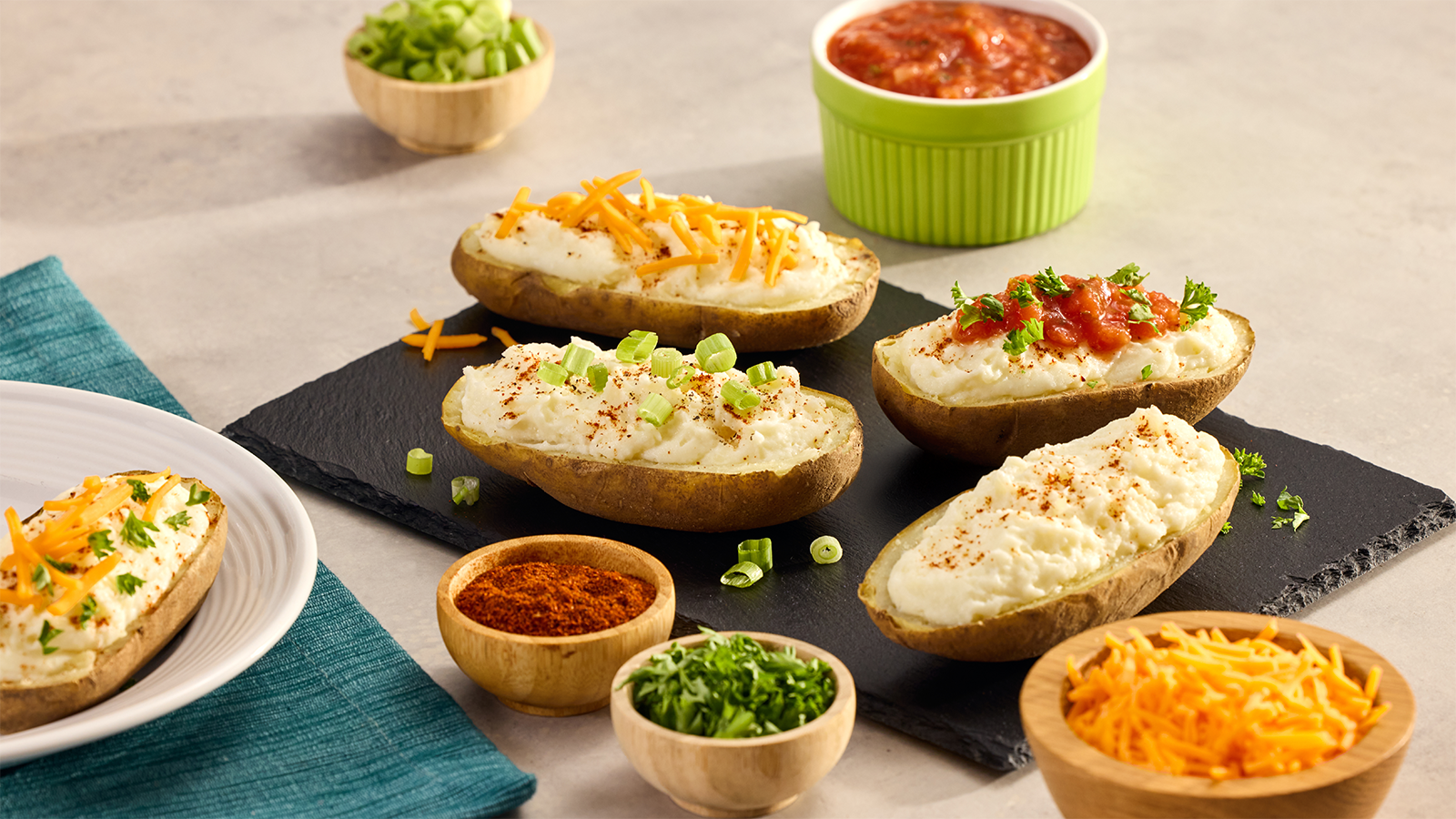 - Slice each potato in half lengthwise (use caution, potatoes will be hot). Using a spoon scoop potato out of the skin, leaving about ¼-inch thick shells. Set potato aside.