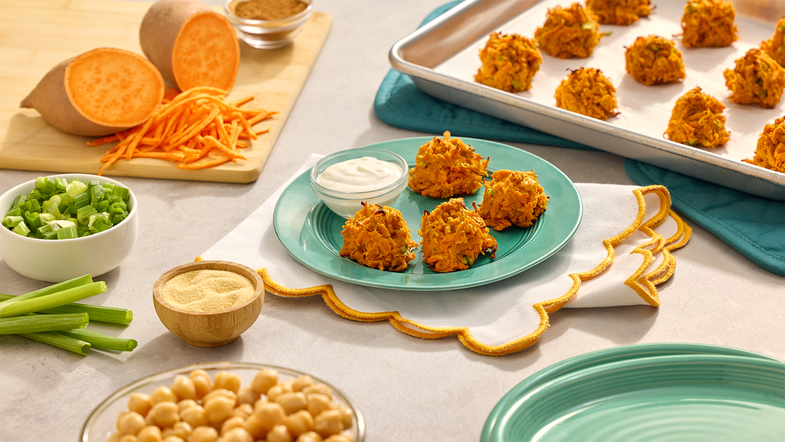 6. In a medium bowl, combine shredded sweet potatoes, pureed garbanzo beans, green onions, vegetable oil, salt, garlic, pepper, onion powder, and cinnamon. Mix well. Cover and refrigerate for 40-45 minutes to make tots easier to form.