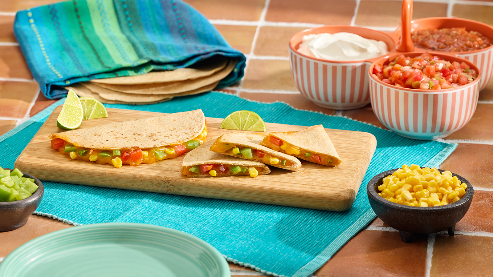 4. Heat tortillas in a large skillet over high heat; place equal amounts of cheese and vegetables on each tortilla; fold in half and continue to cook until cheese is melted and tortilla is crisped and lightly brown.  Serve while hot.