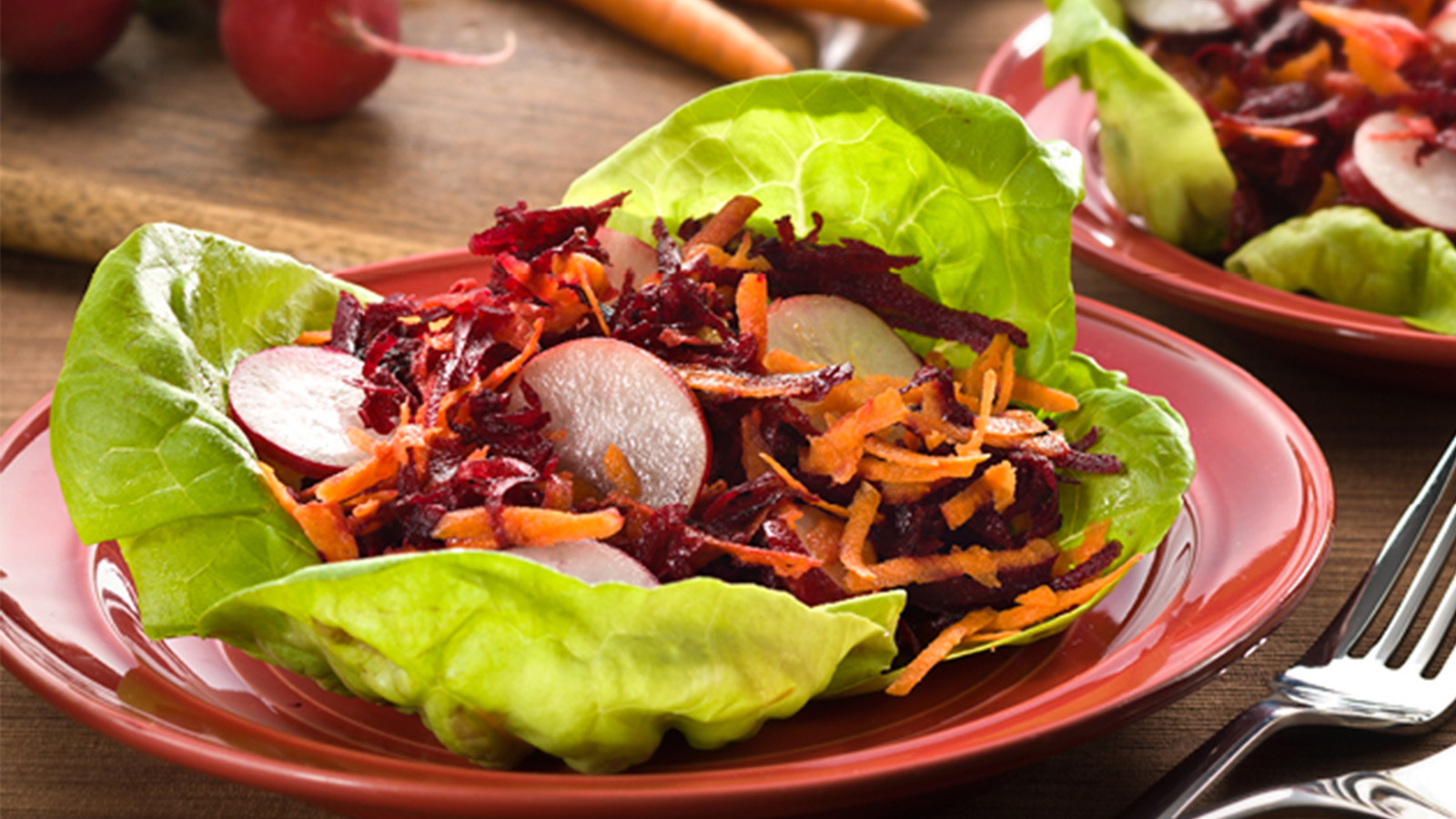 - Arrange carrots, beets, and radishes on top of lettuce.