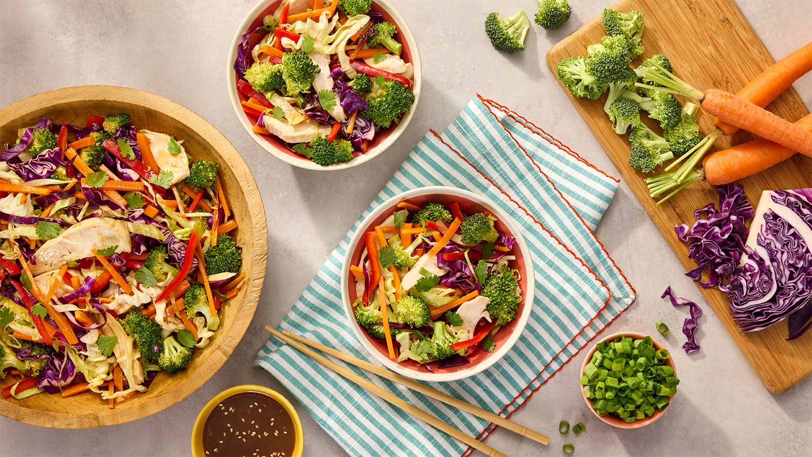 2. Cut chicken breasts into small strips and place in a medium bowl with onions, broccoli, carrots, bell peppers, and cabbage.