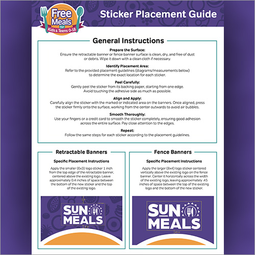 This guide provides clear instructions on where and how to place promotional stickers for maximum visibility and compliance on older materials. Includes placement examples for take-home the fence banners and pull-up banners.